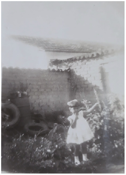Iconografias de crianças revelam um nível de significação essencial da casa nas telas das artistas do Clube, envoltas por cenários naturais e brincadeiras antigas. Cinco delas são exemplares dessa abordagem pueril: a primeira é de Gláucia Maria Campelo, nomeada Sonho de infância (Figura 13), de 2019, elaborada para a exposição “Brasil: em busca do paraíso perdido, o mundo das flores e das ervas”. A artista reconstruiu seu autorretrato a partir da foto em preto e branco (Figura 14), tirada no jardim da casa de sua mãe, onde havia muitas flores e uma específica chamada Angélica, da qual gostava muito e tinha a sua altura. Em suas lembranças, o jardim era maravilhoso, pleno de flores coloridas, mas a foto antiga e sem nitidez não lhe permitia ver com precisão o seu rosto, por isso o fez baseando-se no rosto de sua neta. As duas imagens mostram, claramente, dois modos de ver: à direita, observa-se ao fundo pneus velhos jogados, pois seu pai era motorista de caminhão. Já na imagem à esquerda, há paleta de cores em profusão vindo das flores que tingem o chão, em seu braço esquerdo pousa um passarinho, e, no entorno, borboletas coloridas sobrevoam, tudo sob um teto celestial guarnecido de matizes azulados.