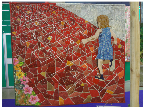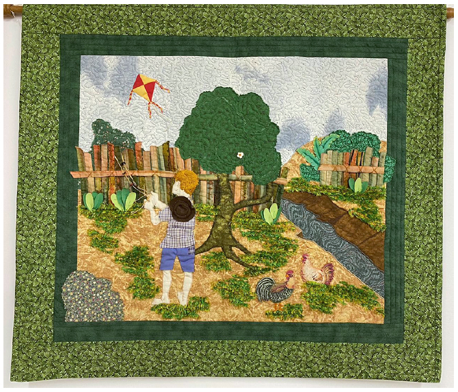 Sonhos e travessuras de um menino (Figura 19) foi a tela de Maricéa Rezende Almeida, de 2005, para a exposição “Quilts na literatura brasileira”. A artista inspirou-se no romance juvenil Meu pé de laranja lima, escrito em 1968 por José Mauro de Vasconcelos, uma obra decerto bem apropriada à vertente da brasilidade do Clube, haja vista, por exemplo, a definição ao autor conferida por Álvaro Duarte: “Seus livros têm o perfume das matas, a beleza dos pássaros, a amenidade dos rios e o fragor das cachoeiras. Tudo cheira a Brasil”.85 Foi a primeira tela produzida por Maricéa Rezende Almeida, porém já demonstra esmero em certos detalhes, como as dobras no shorts do menino, sugerindo movimento no corpo. O cenário é típico da zona rural: riacho, árvores e galinhas no quintal, e a brincadeira do menino é soltar pipa, um modo encontrado pelas crianças para darem asas a sua imaginação e sobrevoar os ares. No caso do Zezé, o protagonista do livro, brincar com a imaginação era uma forma de sublimar sua vida cheia de conflitos familiares e pobreza, em que nem no Natal recebia brinquedos, mesmo deixando seus sapatinhos do lado de fora da porta de casa.