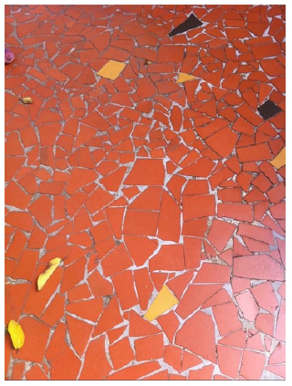 Outra tela com expressão autobiográfica, baseada em foto e representando brincadeiras infantis à moda antiga, é de Rita Rocco, chamada Eu e a amarelinha (Figura 17), de 2016, apresentada na exposição “Brasil: quintais, sítios e fazendas”. O corte temporal da tela é de aproximadamente 1964, quando a artista morava na chácara dos seus pais, onde havia um imenso quintal feito de caquinhos de cerâmicas, sobre o qual riscava para, desacompanhada, brincar de amarelinha, já que seus irmãos eram todos bem mais velhos. Ao retratar esse doce tempo de meninice, Rita Rocco pesquisou sobre a produção desses caquinhos (Figura 18) e descobriu que eram pessoas de menor poder aquisitivo que tinham quintais assim, inicialmente feitos de restos de piso, mas que depois virou moda, levando a própria indústria a quebrar as cerâmicas novas para vendê-las.
