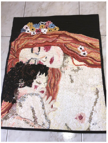 Vale refletir sobre a escolha da artista ter incidido sobre uma pintura de Gustav Klim (1862-1918), um pintor austríaco que se destacou no movimento art noveau, na virada do século XIX em Viena. Além do recorte da obra em específico simbolizar a maternidade, há dois outros pontos em destaque: o primeiro é a ênfase dada pelo autor aos tecidos estampados, embelezando vivamente suas pinturas, o que certamente chama a atenção de artistas da arte têxtil; o segundo ponto remete a algo mais complexo, a representação do feminino. José Molina e José Justo asseveram que Klimt é conhecido por ter escandalizado a burguesia e aristocracia vienenses do início do século XX com sua forma de retratar mulheres nuas ou semi-nuas, frequentemente ruivas e de lábios carnudos, por suposto, portadoras de grande erotismo e, por vezes, de olhos fechados. Contudo, o artista não se restringiu a essa única leitura feminina: incorporou também diversos outros elementos, além da sedução pelo erotismo e o romance, como deusas, prostitutas, bruxas, assexuadas, lésbicas, subjugadas, maléficas, histéricas e etéreas. Portanto, há uma multiplicidade do que é ser mulher em um mundo que “anuncia a crise de um modelo liberal e masculino”, pois em uma “Viena ‘fin de siècle’ o imaginário social produzia o feminino fragmentado em mulher e senhora, prostituta e mãe”.93 Tentando buscar uma síntese da representação do autor sobre o feminino, José Molina e José Justo afirmam: “Klim é porta-voz de um feminino que na sua solução se inventa lésbica ou hétero, no autoerotismo ou na assexualidade e (como não?) na maternidade, mas senhora de seus desejos”.94