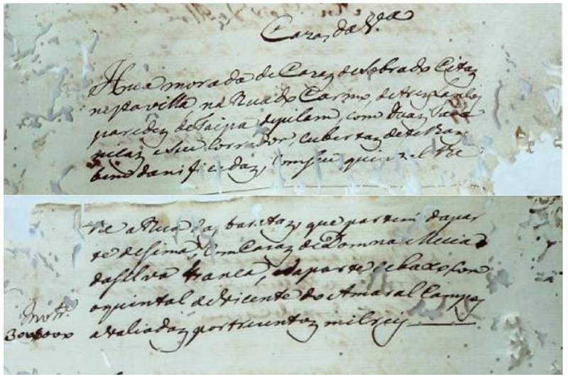Atualmente, destaca-se na platibanda da fachada principal do edifício a inscrição datada de 1867, que remete a obras de renovação arquitetônica, com transformações que utilizavam elementos ornamentais e um esquema compositivo com marcações horizontais e verticais, em um estilo considerado eclético. Evidenciou-se os vestígios históricos da existência da edificação a partir da segunda metade do século XVIII por meio de uma análise documental do acervo do Museu, como é o caso do inventário do Capitão José Manoel da Fonseca Leite (Figura 1), datado de 1798, em que é possível identificar a existência do edifício na Rua do Carmo, atual Rua Barão de Itaim, descrito segundo suas características construtivas, com paredes em taipa de pilão e telhas danificadas.8 Depois a edificação tornou-se propriedade da esposa do Capitão, D. Josepha Maria de Góes. No inventário de Góes consta a existência do sobrado, em que eram realizadas reformas para a instalação de “molduras para o forro”.9