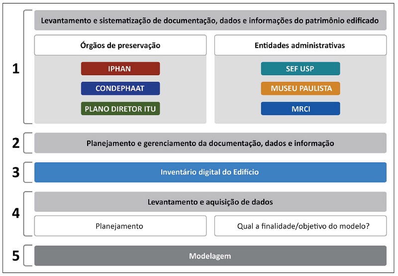 No cenário nacional, o Instituto do Patrimônio Histórico e Artístico Nacional (IPHAN) caracteriza o processo de projetos de preservação de bens patrimoniais em etapas que podem ser definidas em: pesquisa histórica, levantamento físico, análise tipológica e análise do estado de conservação.7 Estes processos demandam uma equipe multi e interdisciplinar para aquisição de dados, análise, elaboração de modelos, projetos e relatórios.