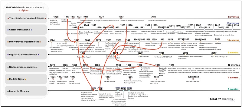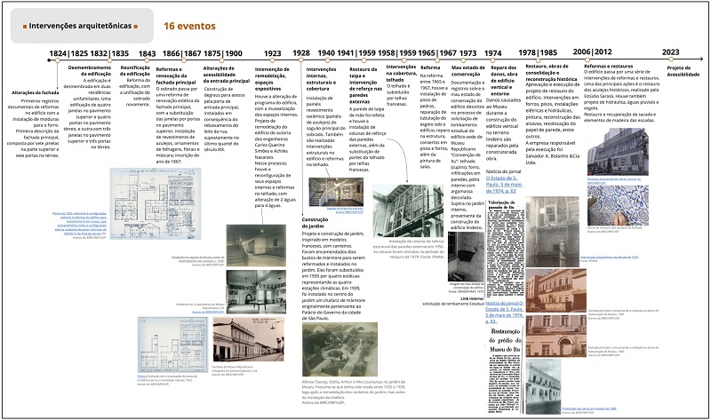 Após o devido cotejamento, gerenciamento e análise de todo esse acervo documental, obtiveram-se a informação semântica e a documentação espacial arquitetônica do edifício histórico. Como parte do processo de sua organização, foram construídas linhas temporais organizadas a partir de uma curadoria de eventos relativos a um tema específico, as quais foram organizadas de forma cronológica levando em conta diversos aspectos - administrativos, arquitetônicos e urbanos -, que permitiram o desenvolvimento e planejamento dos levantamentos físicos e espaciais, análises dos aspectos materiais e construtivos e, por conseguinte, do estado de conservação do edifício histórico, possibilitando que os projetos de conservação e manutenção sejam realizados com a devida acuidade.