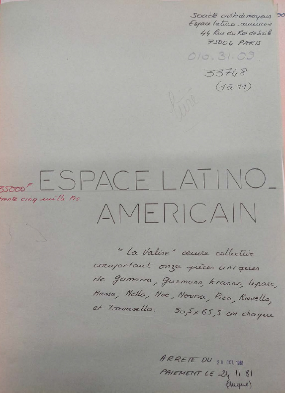 No Espaço, realizaram-se diversas exposições coletivas, que eram consideradas prioritárias, assim como algumas individuais, especialmente de membros do grupo. Durante os anos de 1981 a 1984, tiveram ajuda de custo do Estado francês na forma de subvenção, bem como apoio de outros artistas latino-americanos que estavam no país, como Antonio Seguí, Jesus Soto e Roberto Matta, entre outros. Esses deixavam suas obras ali à venda, revertendo para o local a verba derivada da transação. Diversas obras adquiridas pelo Cnap são provenientes desse espaço coletivo, como: Portrait du nom de Paris, de Horacio Garcia-Rossi; Modulation 452, de Julio Le Parc; Objet plastique, de Luis Tomasello, Peuples de la terre de perrouquet, de Gontran Guanaes Netto; e Relief, de Luis Zárate. Mas indubitavelmente, a obra que mais vezes aparece citada na base é La Valise.