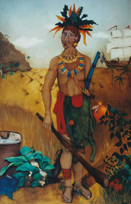 A consulta aos arquivos e relatórios revelou que algumas dentre as acima citadas tiveram obras adquiridas pelo Cnap, mas sem estarem associadas jamais ao “grupo latino-americano”. Esse é o caso da argentina Alicia Zadán,74 que participou da mostra e, em 1984, teve uma obra similar, provavelmente pertencente à mesma série, adquirida. Trata-se de Le Cannibale (Figura 3), que se encontra hoje na embaixada francesa no Chile. Uma tela de grandes dimensões em que um homem indígena está em primeiro plano, sozinho, portando armas simples para se defender do que está atrás: um grande navio que alude ao início da colonização. A artista faz uso de uma representação exótica, recorrendo à tipificação do indígena e a um ambiente “tropical”, mas claramente se trata de algo irônico, pois é inevitável pensar que o protagonista é bastante frágil, ainda que armado, para resistir à grande máquina do empreendimento colonial. Observando o título não há como não se perguntar, afinal, quem é o “canibal” nesse processo?