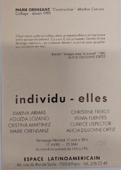 O título da mostra comporta uma brincadeira entre a noção de indivíduo e de elas (elles, em francês). Ainda que seja sagaz, é importante lembrar que, dentro da lógica dominante nas esquerdas dos anos 1970 e 1980, o caráter individualista e burguês do movimento feminista era aquilo que o tornava tão malvisto. Para emergirem naquele universo, as mulheres precisavam pagar um preço alto: como artistas precisavam afirmar sua individualidade, no entanto, isso as afastava dos valores comunitários dos grupos de esquerda latino-americanos. É certo que elas procuraram, e ainda hoje em seus discursos reiteram, concretizarem o desejo de serem vistas como independentes, livres das “prisões simbólicas” que os rótulos de “esquerda”, “latino-americana”, “exilada”, “feminista” poderiam impingir. O preço pago por tal desejo de autonomia e afirmação de suas individualidades foi a invizibilização de suas trajetórias e obras, mesmo em se tratando daquelas que lograram fazer parte de uma pequena elite artística mundial, cujas obras pertencem, hoje, a uma importante coleção pública francesa.