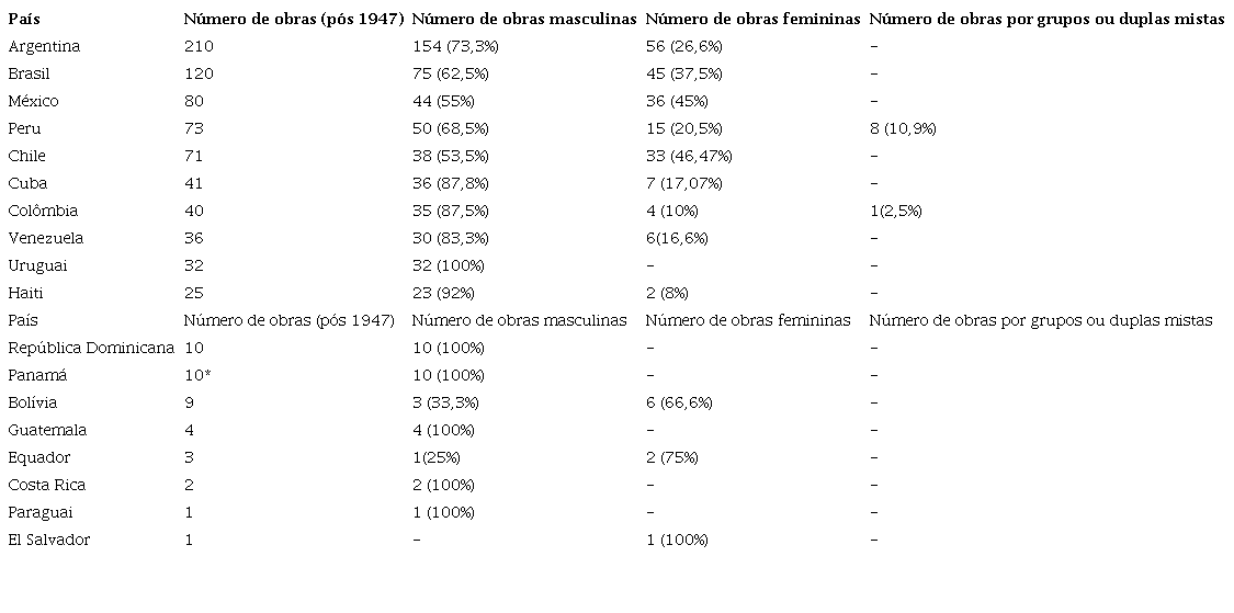 Os números apontam uma heterogeneidade expressiva entre os países em termos de representação, variando desde mais de duas centenas no caso dos argentinos até uma única obra paraguaia.20 Também do ponto de vista das relações sexo/gênero as diferenças são notáveis, havendo casos de uma quase paridade, como o do Chile ou México, passando pelos casos da Bolívia e Equador em que a maior parte das obras é assinada por mulheres,21 até países como o Uruguai, República Dominicana e Panamá, nos quais a totalidade das obras é produzida por artistas do sexo masculino.22