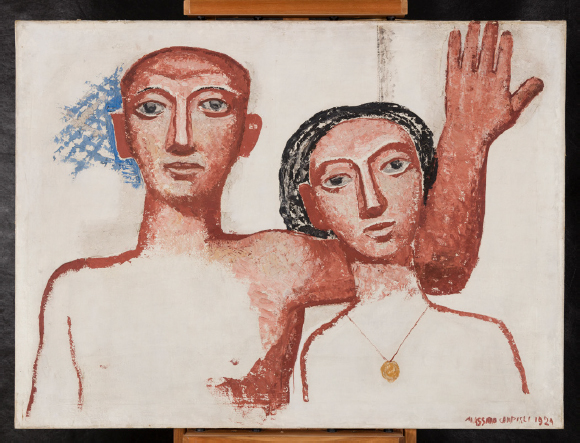 Feita em 1929, e adquirida em 1947 por Ciccillo Matarazzo e Yolanda Penteado para o antigo MAM, Os noivos só passou a ser exibida a partir de 1951 em São Paulo,59 e seu único proprietário foi o Museu. Diferente é o caso de Gli sposi da coleção The University of Michigan Museum of Art, que foi exposta no ano seguinte à sua feitura no Kunsthalle, em Basiléia.60 Logo, é plausível imaginar que a pintura Os noivos do MAC USP tenha ficado guardada justo por ser um estudo, recebendo a assinatura depois.