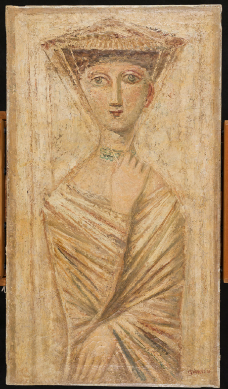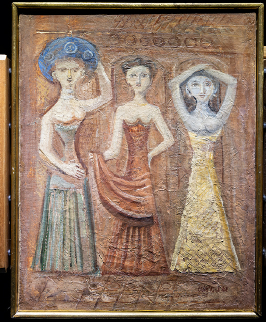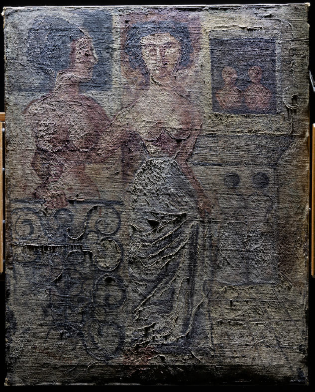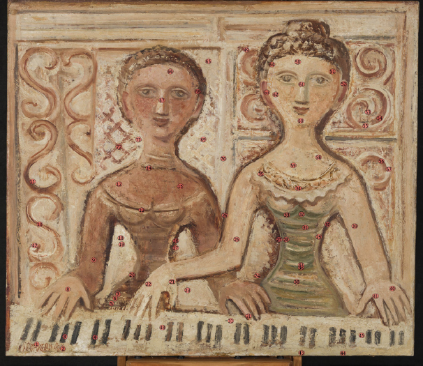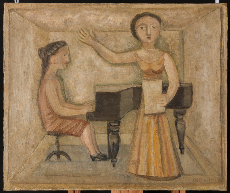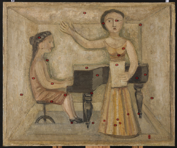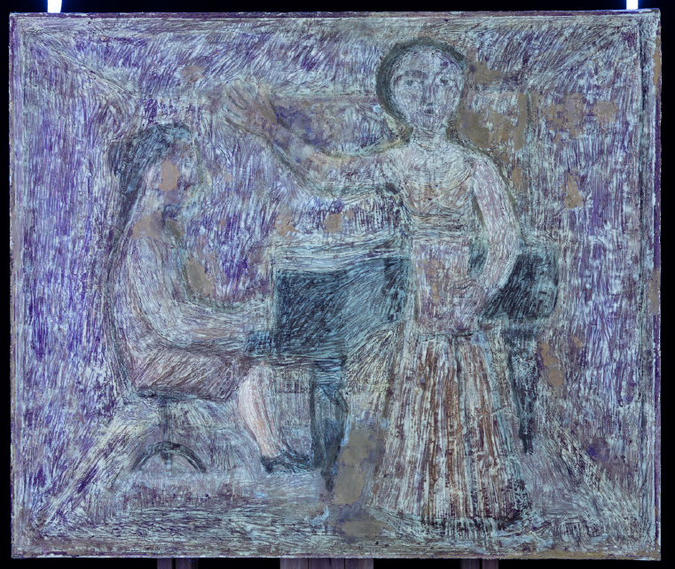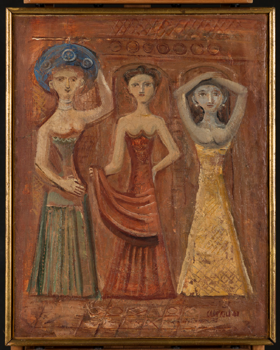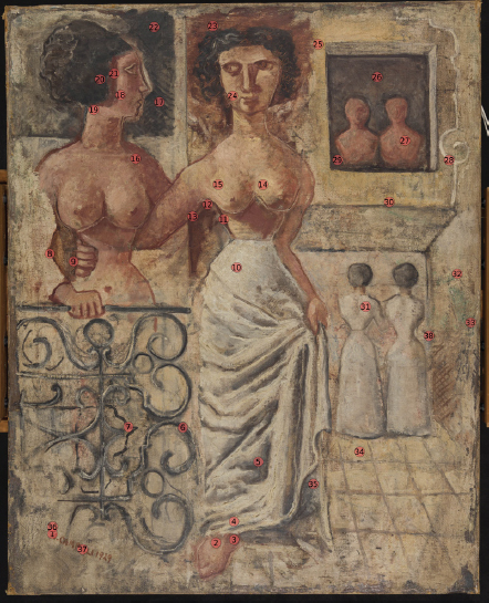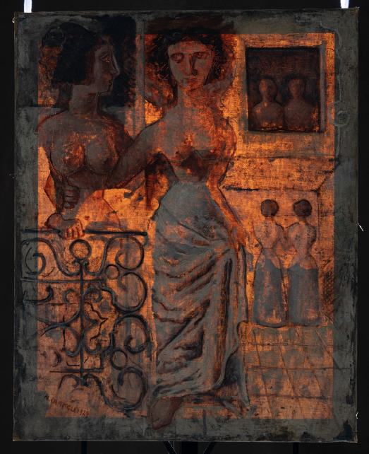 Voltando às pinturas do artista do MAC USP e o processo artístico de Campigli, vê-se que, embora a linguagem plástica “arcaica” e a presença da figura feminina sejam constantes nas seis telas, as pinturas diferem no que tange às soluções técnicas empregadas. As duas pinturas de 1929, Os noivos e Mulheres a passeio, pertencem à “virada etrusca” sofrida no ano anterior. Como discutiremos, elas trazem elementos mais literais do mundo antigo, além de uma superfície mais lisa, com menos camadas pictóricas. Isso também é observado em Três mulheres, de 1940. Já as três outras obras - Mulheres ao piano e Mulher velada, ambas de 1946, e A cantora de 1949-1950 - contam com várias camadas de tinta, raspagens e um aspecto mais matérico, além de serem similares à outras obras feitas nos mesmos anos por Campigli, hoje localizadas em coleções no exterior.