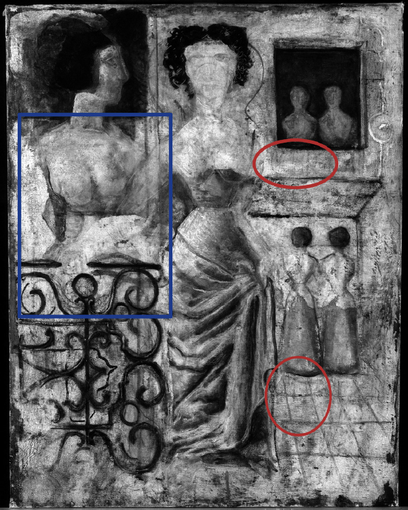 Dado curioso diz respeito à posição de braços das figuras femininas de Donna alla fontana e Mulheres a passeio. Em Donna alla Fontana, ela segura duas ânforas, mas seu braço direito parece estar na mesma posição da figura da direita de Mulheres a passeio, enquanto essa segura na cintura da figura feminina com rosto de perfil. A diferença é que a inclinação dos braços é distinta, assim como a demarcação do ombro em cada obra. Além disso, em Mulheres a passeio, o braço esquerdo da figura feminina à direita, que ergue e segura a saia, tem pouca relação com a anatomia real do braço de uma figura humana. Ele parece ter sido alterado depois, como demonstra a comparação das imagens obtidas pelas técnicas VIS e RIV. Ainda sobre o braço direito da figura da direita de Mulheres a passeio, com as imagens obtidas com RIV, vemos que, em sua posição inicial, estava abaixado, como se estivesse segurando na grade (Figura 12, marcação com retângulo azul), e não na horizontal, como observamos na imagem da obra com iluminação normal. Uma hipótese é que a figura tenha sido pensada para segurar um cachorro (ou ânfora, como em Donna alla fontana), e não estar com o braço à cintura da outra figura feminina. Corroboram com essa ideia duas coisas: (1) há outras pinturas de Campigli em que representações femininas semelhantes estão com o braço para baixo, segurando o animal;69 (2) a figura da esquerda parece ter sido acrescentada depois, dada a sobreposição entre as imagens das mulheres e a ausência dos braços da figura à esquerda, conforme indicado também pela marcação em azul no imageamento por RIV (Figura 12).
