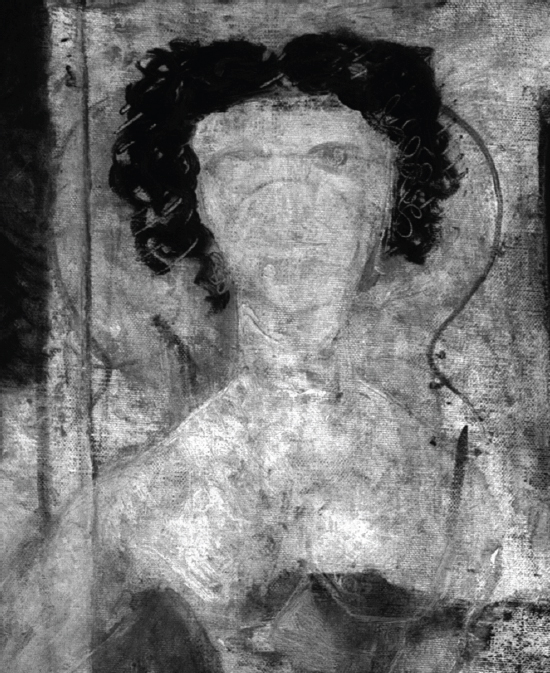 Totalmente diferente do que vemos a olho nu, a imagem de RAD da obra (Figura 16) revelou o que estava oculto sob a superfície da tela: um retrato que não está catalogado no raisonné do artista. A dra. Eva Weiss, especialista na produção de Campigli e uma das responsáveis pela organização do raisonné de Campigli, diz ser um retrato feito pelo artista, e não um autorretrato, mas talvez um retrato feminino.77