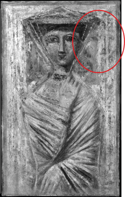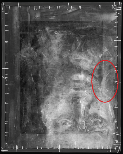 Outro dado interessante revelado pelas análises é que, além do rosto, há um braço pendente na vertical, ao lado esquerdo do rosto (indicado pelo círculo vermelho na Figura 16). Ou seja, possivelmente mais de uma pintura foi realizada antes de receber Três mulheres.