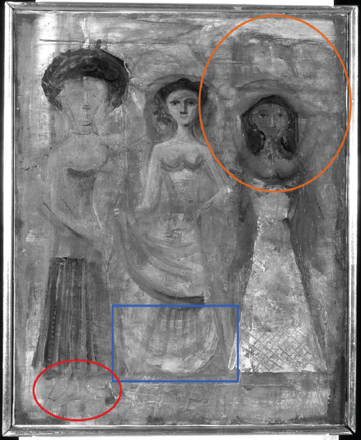 No que diz respeito a possíveis arrependimentos do artista, a comparação da imagem visível da tela com a imagem de RIV (Figura 17) revela várias surpresas: elementos arquitetônicos ao fundo (marcação com círculo laranja); o posicionamento de braços da figura à direita (também indicado na marcação com círculo laranja); o pé da figura da esquerda, que acabou sendo eliminado da versão final (marcação com círculo vermelho). Há ainda o esboço de uma saia arredondada na figura do meio (marcação com retângulo azul), o mesmo tipo de saia que ele insere em outra obra,80 mas que aqui é deixado de fora na versão final, conferindo mais rigidez à composição.