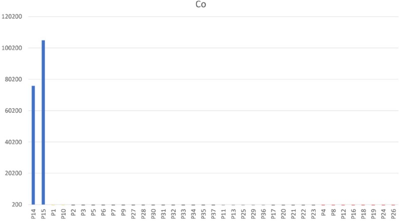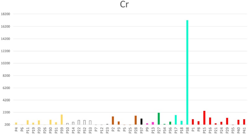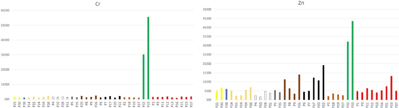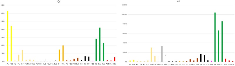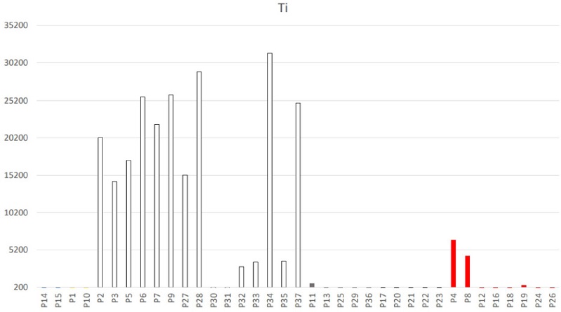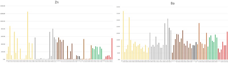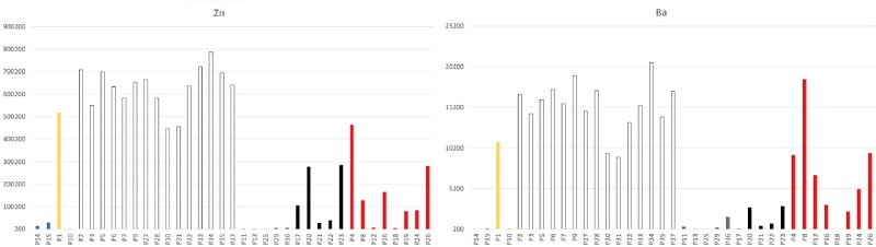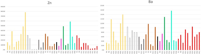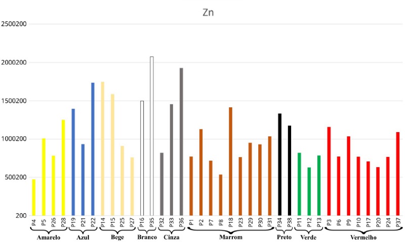 Há vários brancos na tela. O branco-de-prata, nomenclatura usada para o branco-de-chumbo,85 está presente no retrato oculto (a imagem RAD evidencia muito bem isso nas regiões mais brancas), enquanto o branco-de-zinco, parece ter sido usado como base de preparação para a nova obra, cobrindo o retrato, conforme o resultado das análises de FRX-DE, que mostram contagens altas de zinco para todos os pontos medidos na obra (Figura 18). O titânio, também medido em todos os pontos da tela, embora em quantidade proporcionalmente mais baixa em relação às de zinco e chumbo, pode indicar que o artista tenha utilizado o branco-de-titânio tanto na mistura dos pigmentos como na base de preparação.