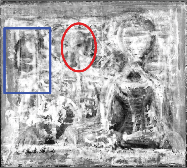O imageamento por RIV (Figura 7) demonstra que não há indícios de uso de grafite e, portanto, não são encontrados indicativos de estudos preparatórios ou correções de esboços (chamado pentimenti). Talvez a única exceção seja a posição da mão da figura masculina, que parecia estar ligeiramente inclinada à direita (como indicado pela marcação com círculo azul, na posição prévia do dedão) e na versão final está em posição mais verticalizada.