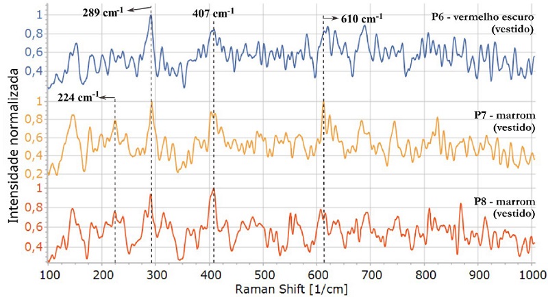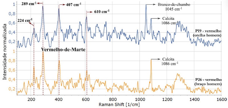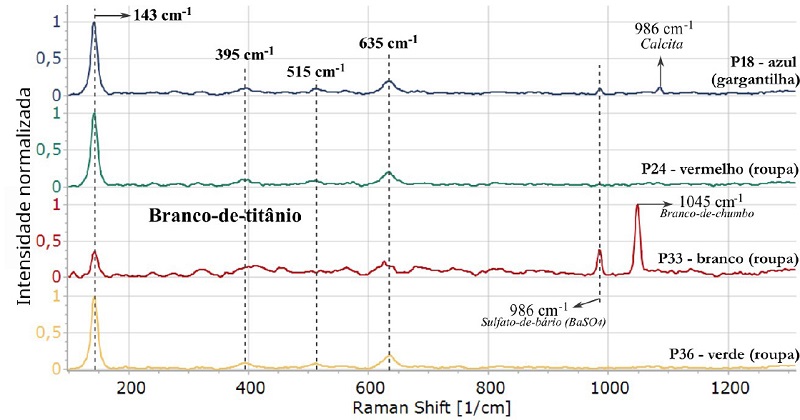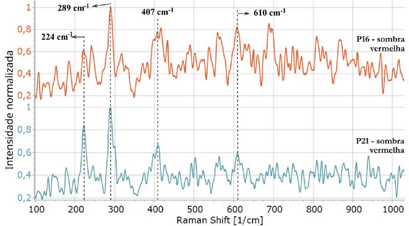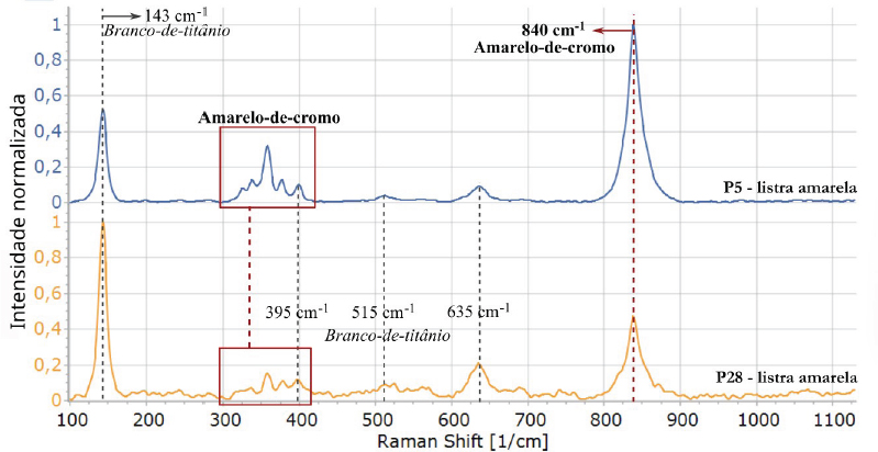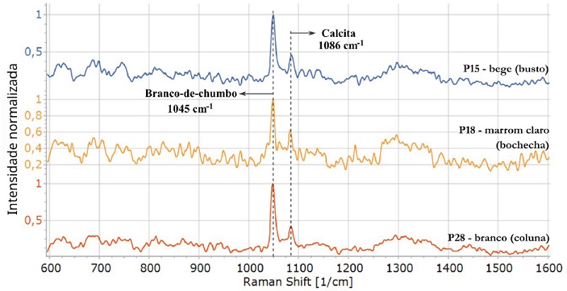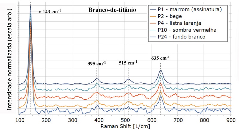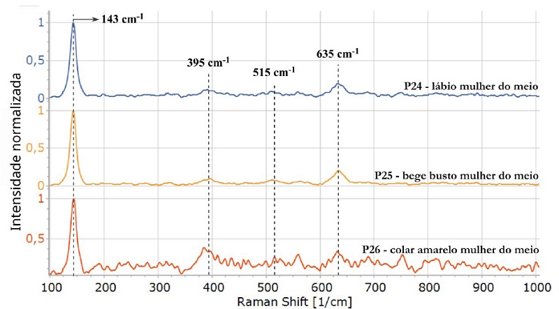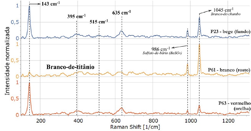 Com efeito, com as espectroscopias de FRX-DE e Raman se levanta a possibilidade do branco-de-chumbo (identificado pela presença da banda característica no espectro Raman) e branco-de-zinco (identificado pela alta contagem de zinco nos espectros de FRX-DE, sem correlação com o elemento bário) terem sido usados como base de preparação, junto de calcita (pigmento identificado na análise por Raman). Quanto aos vermelhos, localizaram-se pigmentos à base de ferro, como o vermelho-de-Marte (determinado nas áreas analisadas por Raman) e vermelho-ocre, assim como os laranjas (conforme indicado pela alta quantidade de ferro no espectro FRX-DE e pela ausência de bandas características de outros pigmentos no espectro Raman).