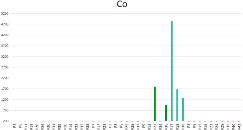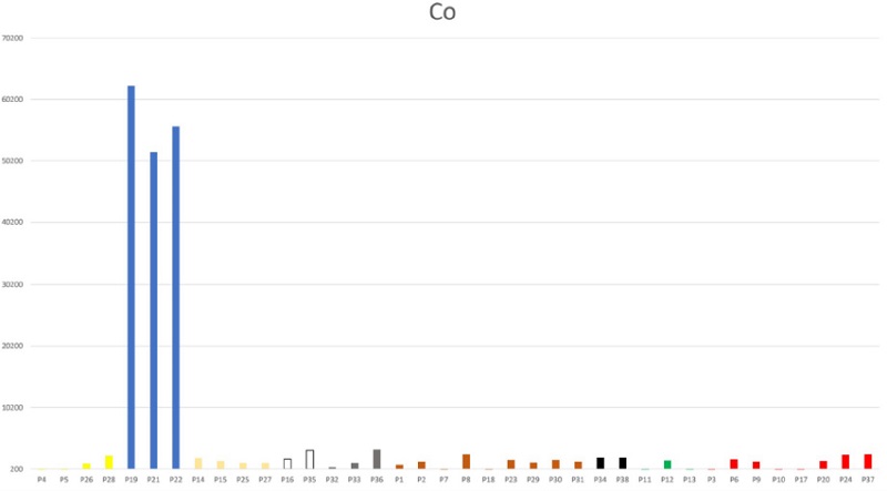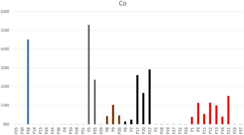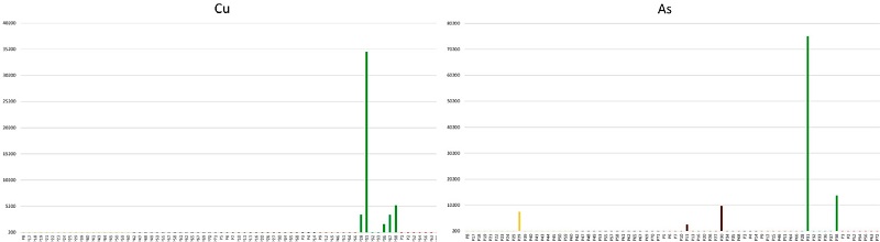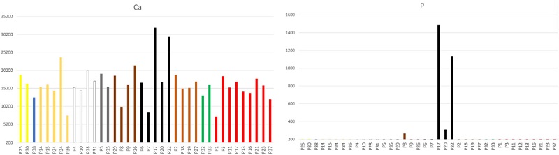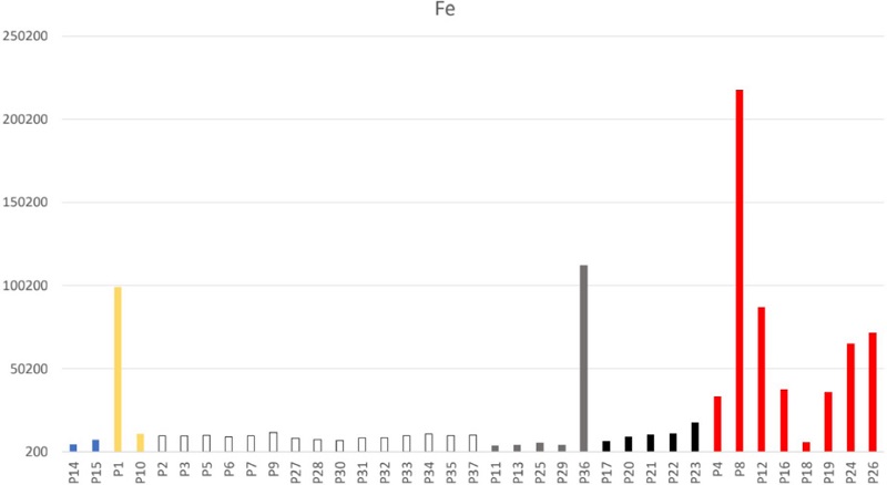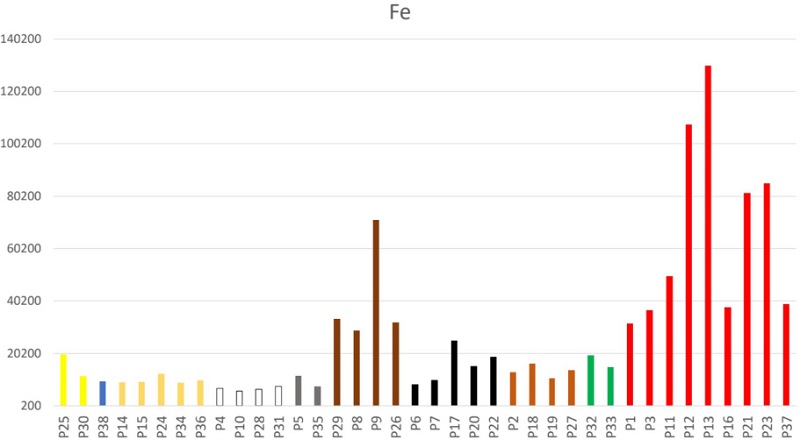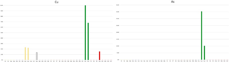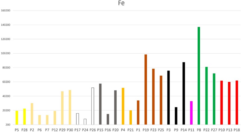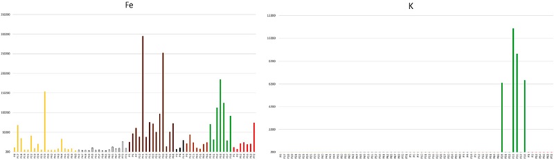 Voltando aos pigmentos enumerados na publicação citada, além do branco-de-chumbo, foram identificados nas análises de FRX-DE: o azul-de-cobalto (presença de cobalto), o amarelo e vermelho-ocre (presença de ferro) - este último chamado de vermelho-de-Veneza86 por Campigli -, o pigmento umbra-queimada (presença de ferro e manganês), o verde-veronese (presença dos elementos cobre e arsênio), terra-verde (presença de potássio e ferro) e preto-de-osso ou marfim (presença de fósforo e cálcio).87