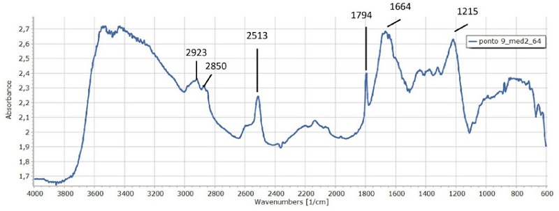 Na Figura 4 é apresentado o espectro de uma medição de FTIR feita sobre um ponto branco na obra. Nessa, são feitas as devidas identificações das bandas características de ligação C-H, CH2 e CH3 (2923 cm-1 e 2850 cm-1) que aparecem tanto em aglutinantes à base de óleos como em têmperas. Identificam-se também as bandas em 2.513 cm-1 e 1.794 cm-1, que são atribuídas ao carbonato de cálcio (CaCO3) - também chamado de calcita, comumente utilizado como base de preparação para o depósito de tintas em têmperas - e da banda vibratória em aproximadamente 1660 cm-1, do grupo amida, característica do material proteico. Esse espectro é muito semelhante aos demais obtidos sobre a obra Os noivos, indicando a presença de pigmentos em têmpera sobre a tela.
