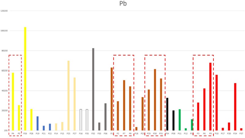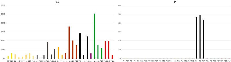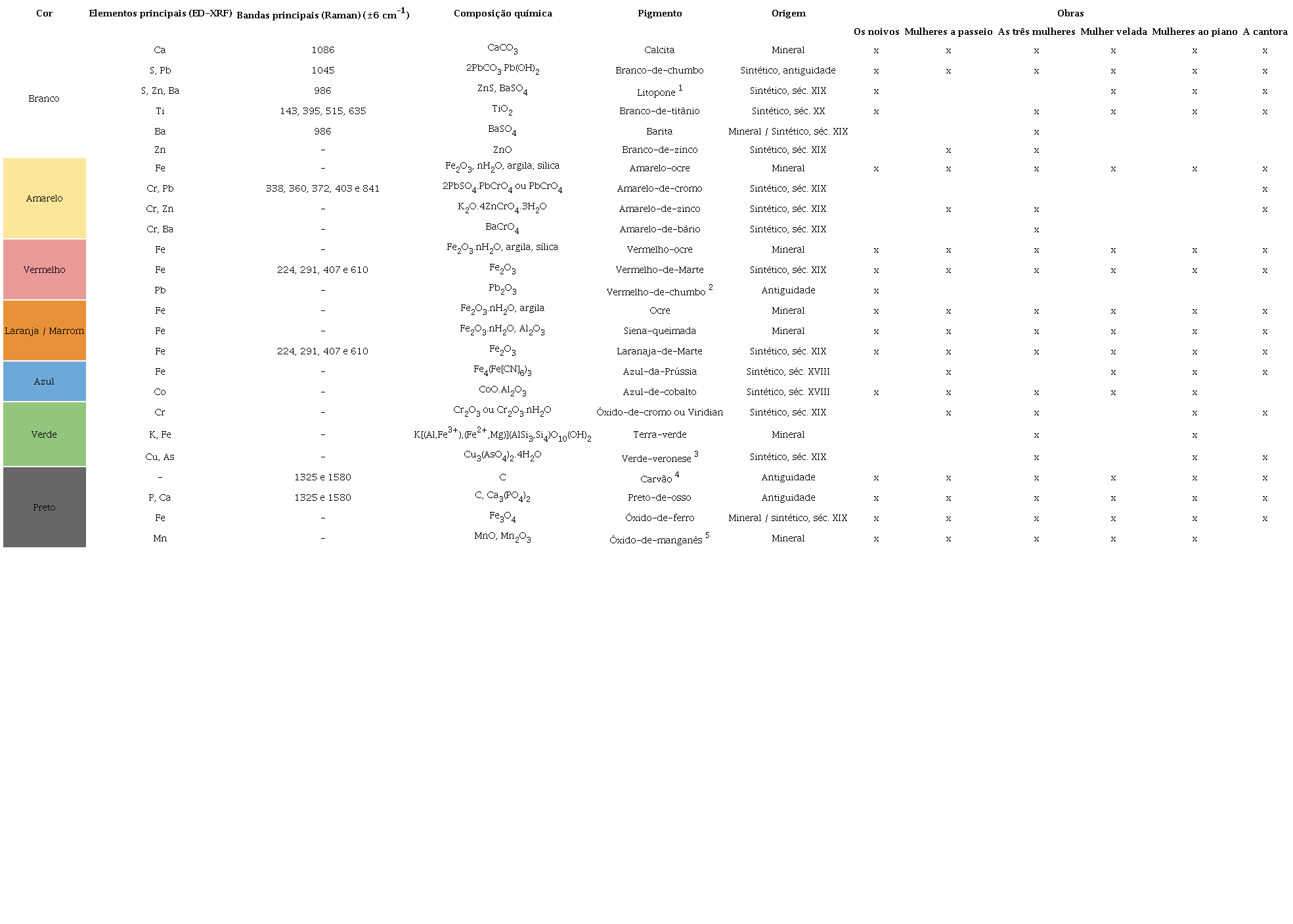 As análises ainda indicam a presença do elemento químico cobalto, sugerindo a utilização do pigmento sintético azul-de-cobalto, e o elemento ferro, que está presente nos pigmentos amarelos e vermelhos indicando a presença de pigmentos minerais ocre (do amarelo ao marrom), e o pigmento sintético vermelho-de-Marte. O elemento chumbo apresenta altas contagens nas regiões espessas, conforme comentado antes, que apresentam uma coloração “branca escurecida”, e sobre os pontos vermelhos. A análise com espectroscopia Raman confirmou que o chumbo nessas regiões brancas é proveniente do branco-de-chumbo. Por outro lado, a ausência de indicativos, através da análise Raman, do pigmento branco-de-chumbo sobre alguns pontos vermelhos sugere ainda o uso de vermelho-de-chumbo. A detecção de grandes quantidades de fósforo e cálcio nas áreas com pigmentos pretos e escuros medidas com FRX-DE, e seus respectivos espectros Raman, confirma a presença do pigmento preto-de-osso.55 Logo, quanto ao uso de “cores químicas”, com exceção dos pigmentos naturais preto-de-osso e ocre, os demais pigmentos empregados são inorgânicos e artificiais.56
