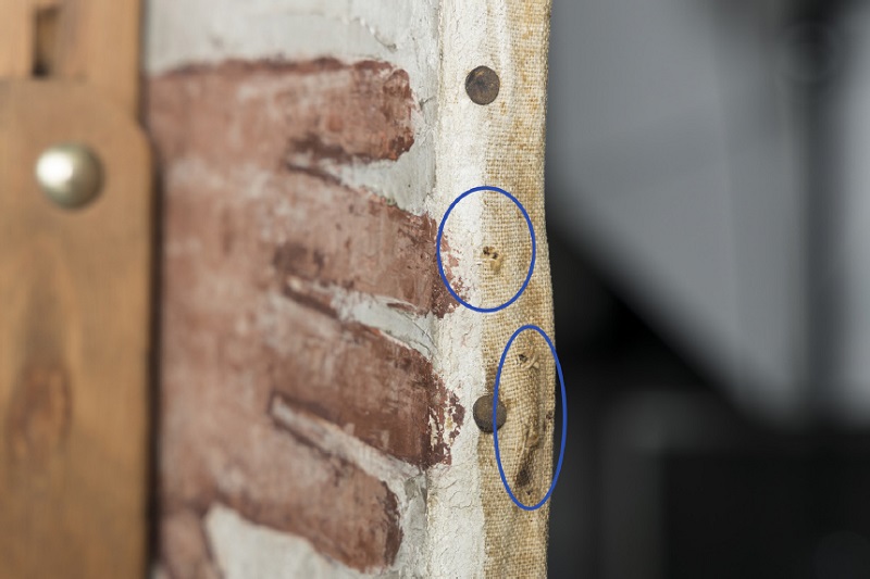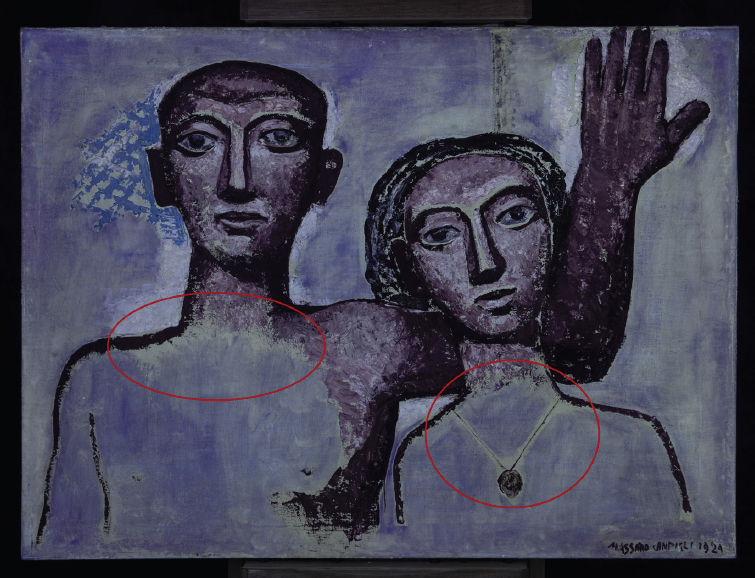 Outro dado importante surge da observação da Figura 7, na qual vemos que partes dos dedos da figura masculina acabaram ficando para fora da parte visível da tela. Novamente, como sugere Poldi, é possível pensar que o artista não tenha achado um chassi no tamanho ideal para a tela, o que fez com que essa parte da camada pictórica não fosse visualizada. Como o estudioso conta, Campigli comprava as telas e as fixava em um chassi provisório, o que permite que se veja pequenas perdas e furos prévios, resultantes da fixação, na lateral da tela - como indicado com círculos na Figura 9.
