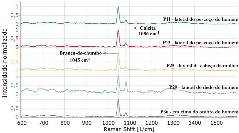 Vemos que a paleta de Os noivos é restrita: branco, preto, tons terrosos - laranjas e marrons - e o azul. No caso do branco, embora pareça um tom uniforme, as análises com FRX-DE e Raman revelam o uso de quatro tipos de branco: litopone (constituído por zinco e bário), branco-de-chumbo, branco-de-cálcio (calcita) e o branco-de-titânio. A presença dos brancos litopone e branco-de-titânio foi reafirmada com o registro da UV-VIS,51 que possibilitou diferenciar as regiões onde pelo menos dois desses pigmentos estavam presentes, graças à fluorescência esverdeada do litopone e arroxeada do branco-de-titânio.52 Regiões nas quais são visíveis as sobreposições destes pigmentos estão identificadas em vermelho na Figura 5. Desses brancos, o litopone é sugerido como o pigmento constituinte da base de preparação da pintura, junto com a calcita, enquanto branco-de-titânio está presente apenas na camada pictórica. O branco-de-chumbo, por sua vez, parece ter sido utilizado para compor regiões com tinta mais espessa, misturado com calcita, próximos aos personagens, conforme indicado nos espectros Raman medidos sobre os pontos identificados com essa característica espessa (Figura 6). Nesses espectros, estão identificadas as bandas características do pigmento branco-de-chumbo, em cerca de 1.045 cm-¹, e do pigmento calcita, em 1.086 cm-¹.
