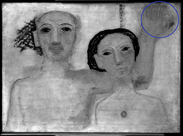Ainda com essa técnica de imagem, outros arrependimentos são revelados, como a posição dos seios da figura feminina à esquerda, que foi modificada. Se antes apareciam em três quartos, na versão final estão completamente representados de frente, assim como o corpo todo, à exceção do rosto, que está de perfil. Novamente, é possível pensar que o artista quisesse reforçar os laços com a produção dos antigos egípcios com essa operação, em que a frontalidade do corpo contrasta com o rosto em perfil.