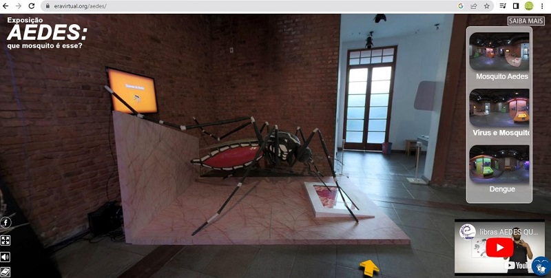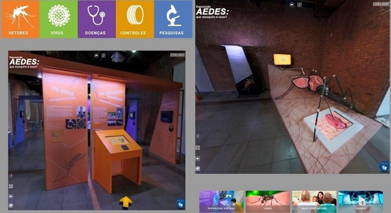 A exposição virtual consiste em imagens tridimensionais da exposição física itinerante, de forma que a imersão no ambiente virtual simula a experiência de visita presencial ( Figura 1 ). Abarca assuntos de saúde pública referentes ao Aedes aegypti , 31 como aspectos da origem e reprodução do mosquito, seu papel como vetor de doenças como dengue, zika e chikungunya e ações para combate à proliferação do mosquito e para prevenção das doenças; a história do mosquito no Brasil, além de um breve histórico mundial; o comportamento dos vírus no organismo do mosquito e no corpo humano; as pesquisas desenvolvidas até o momento sobre vacinas e as formas de controle das arboviroses.