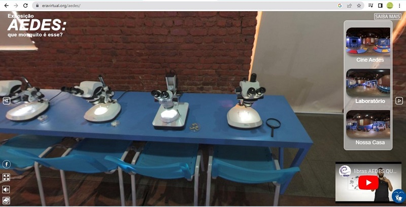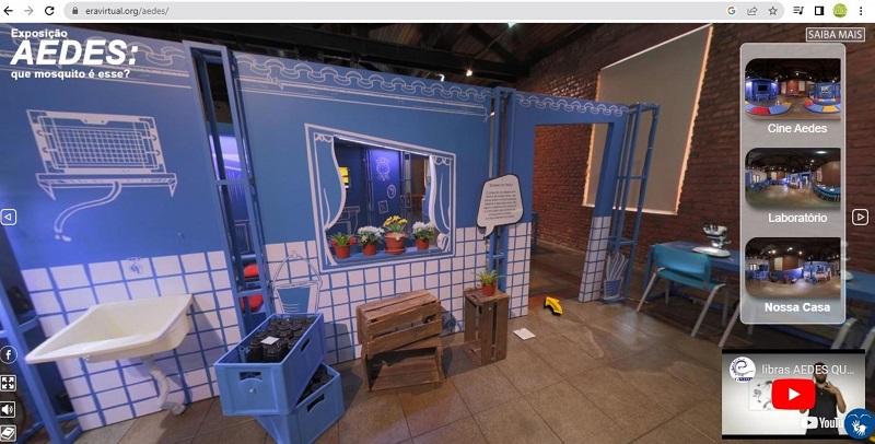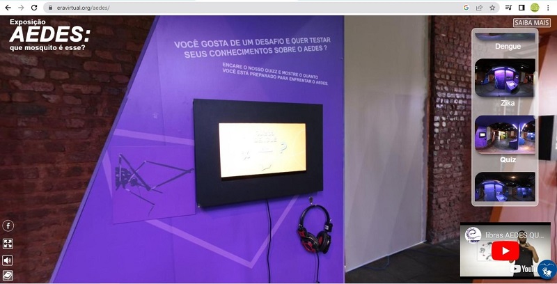 Aedes : que mosquito é esse?” é uma exposição física e itinerante que foi desenvolvida pelo Museu da Vida (Fiocruz, Rio de Janeiro), com o apoio da Rede Dengue, Zika e Chikungunya da Fiocruz 27 e o patrocínio da companhia privada Sanofi, 28 e esteve montada na Casa da Ciência da Universidade Federal do Rio de Janeiro (UFRJ) entre 14 de junho e 27 de agosto de 2017. 29 Sua versão on-line encontra-se disponível através da plataforma Era Virtual 30 e foi lançada em 2018. Note-se, portanto, que se trata de uma criação anterior ao advento da pandemia de covid-19.