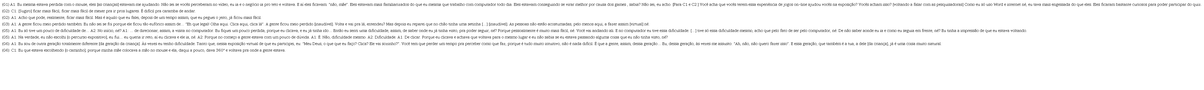 Na análise das visitas gravadas, as dificuldades relacionadas à usabilidade e orientação na exposição ocorreram 47 vezes, por onze minutos e catorze segundos, correspondendo a 8% do tempo total das visitas, distribuídos em cinco das seis famílias participantes (G1, G2, G4, G5, G6). Essa categoria representou as dificuldades do indivíduo no uso do site ou tentativa de manuseio. Em todas essas cinco famílias houve, em algum momento, perda de controle do cursor ou de orientação no ambiente expositivo. Para fins de comparação, em outra exposição identificamos tempo similar de dificuldades relacionadas à usabilidade (treze minutos, correspondendo a 6% do tempo total das visitas). 63