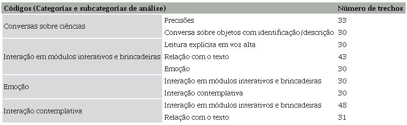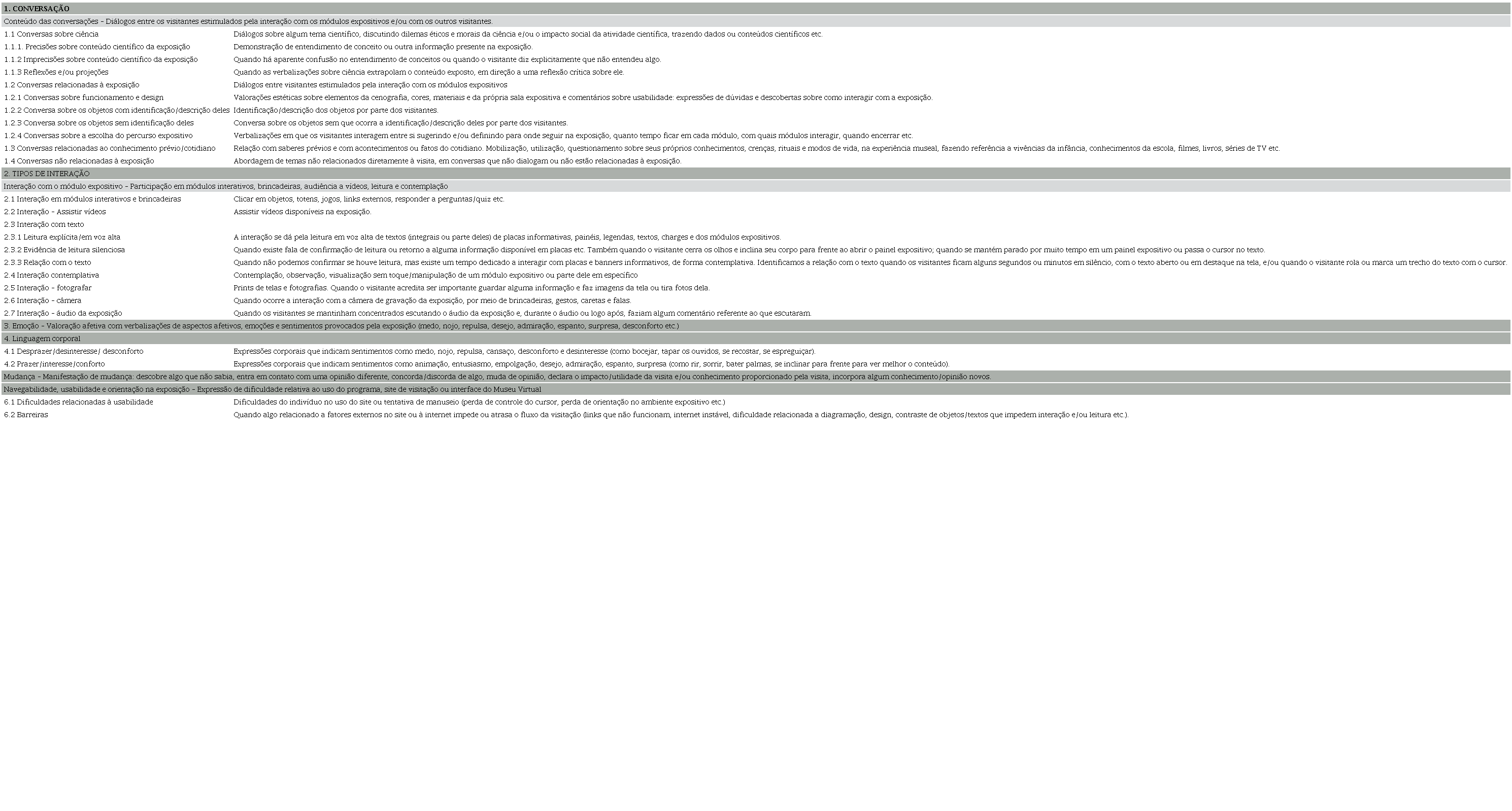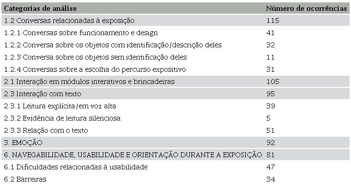 A Tabela 1 sintetiza as cinco categorias que mais ocorreram 53 na análise das visitas: conversas relacionadas à exposição; interação em módulos interativos e brincadeiras; interação com texto; emoção; e navegabilidade, usabilidade e orientação durante a exposição.
