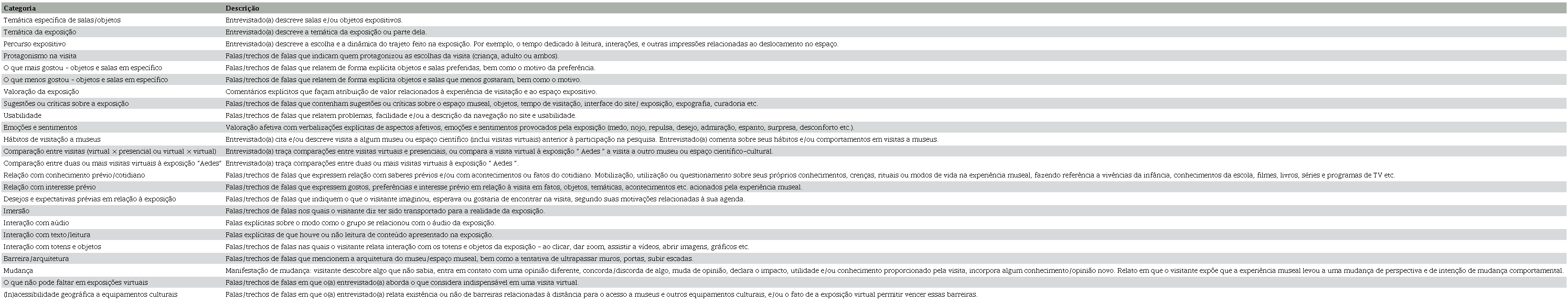 O roteiro de entrevista, por sua vez, era formado por dois blocos: “percepção da família sobre a visita” e “percepção da família sobre o tema da exposição”. Neste artigo somente nos debruçamos sobre o primeiro bloco. Para a análise das entrevistas, as conversas foram transcritas e depois codificadas. O primeiro bloco foi codificado com base em um protocolo elaborado pelo grupo de pesquisa e já utilizado em estudo anterior. 46 Para a análise desta exposição, foi acrescentada uma categoria, a saber, “Interação com áudio”. As categorias são apresentadas no Quadro 4 . Da mesma forma que na análise das visitas, um mesmo trecho podia ser identificado em mais de uma categoria.