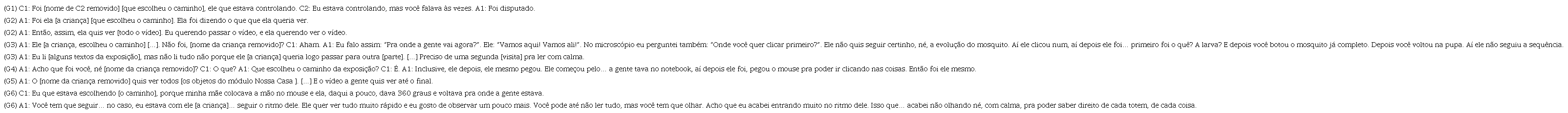 Os grupos 3, 4 e 6 indicaram, nas entrevistas, que consideraram a visita rápida, e, segundo as mães, isso se deu porque elas seguiram o ritmo da(s) criança(s). Segundo os relatos dados durante as entrevistas (exemplos no Quadro 5 ), em cinco dos seis grupos (G1, G2, G3, G4, G6) o protagonismo na visita foi da(s) criança(s), enquanto no G5 consideramos que as escolhas foram compartilhadas (segundo relato do grupo, a mãe manuseava o mouse, mas as decisões eram tomadas em conjunto). Os grupos 1 e 3 disseram que a criança, ou uma delas, manuseou o mouse durante a visita. No G6, a criança manuseou em boa parte da visita, porque, segundo ela, a mãe perdia o controle quando tentava manusear. No G4, em algum momento, a criança passou a manusear o mouse. No G2, foi afirmado que as escolhas foram da criança. Em alguns casos, o protagonismo da criança significou a concessão por parte do adulto, seja se dedicando a algo pelo qual não teve interesse (G2) ou, ao contrário, deixando de explorar algo que gostaria (G3, G6). No caso da mãe do G6, não poder ver tudo o que gostaria, por estar seguindo o ritmo do filho, foi o que mais a desagradou na visita. Também pudemos notar que, às vezes, a avaliação da exposição difere entre adultos e crianças: no G2, um vídeo que incomodou a mãe agradou a filha; no G4, a mãe achou que tinha muito texto, e o filho disse ter gostado de ler na tela; no G1, a mãe mencionou que o deslocamento no espaço foi um problema para ela, mas isso não pareceu ter incomodado as crianças.