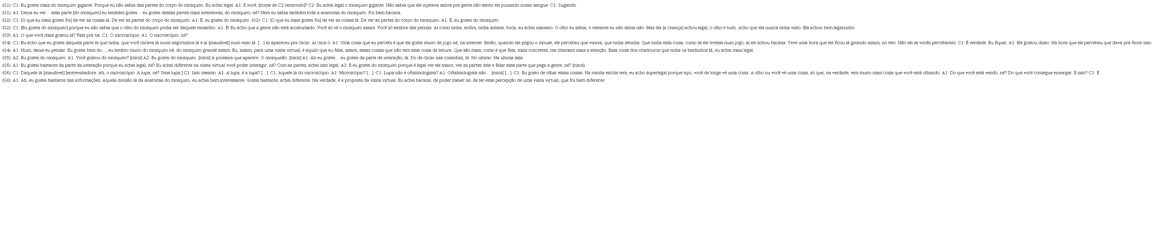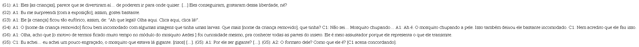 Ocorreram emoções positivas, tais como alegria, surpresa, entusiasmo e euforia, expressas por meio de falas e risadas ao ver diversos objetos e conteúdos, tais como o modelo do mosquito Aedes , as fases de vida do mosquito e microscópios. Nas entrevistas ( Quadro 6 ), ainda que tenhamos notado uma grande diversidade de modos de nomear seus sentimentos e emoções, 54 predominaram, em relação à exposição como um todo, sentimentos positivos como alegria (indicada por sinalizarem terem se divertido ou rido), surpresa e euforia (G1, G2, G3). Emoções negativas também foram identificadas nas análises dos vídeos, algumas vezes sendo confirmadas pelos participantes, nas entrevistas. Identificamos nojo em relação a aspectos do mosquito, tais como o som emitido por ele, as larvas (quando vistas ampliadas) e as partes corporais dele; e frustração ao não conseguir abrir um vídeo ou ler um texto. 55 Com relação aos conteúdos abordados ao longo dos módulos, o “Mosquito Aedes” foi o mais citado em correlação com sentimentos e emoções. A mãe do G6 comentou que o mosquito é assustador pelo que ele representa em relação à possibilidade de ser vetor de diversas doenças graves, ao mesmo tempo que gerou curiosidade. Já a criança do G5 achou o modelo engraçado.