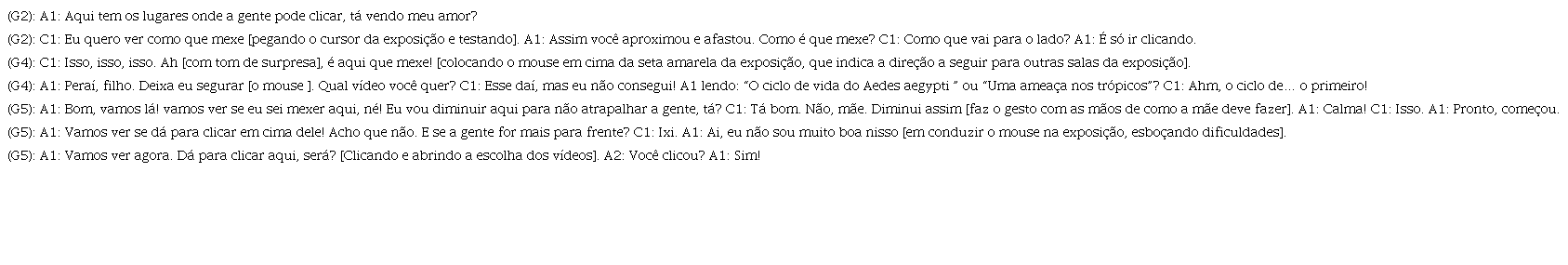 Os dados supracitados indicam que as conversas relacionadas à exposição, em especial aquelas sobre funcionamento e design, foram relevantes nas visitas. Nessa subcategoria, os visitantes conversaram sobre dúvidas relativas às atividades e ao funcionamento do site e da própria exposição. Notamos, em três famílias (G2, G4, G5), episódios em que os visitantes buscam compreender a usabilidade do site ( Quadro 7 ), seja quando adultos explicam para as crianças como interagir com a exposição (G2 e G4), quando as crianças encontram soluções (G4 e G5) ou quando diferentes membros da família vão aprendendo juntos sobre o funcionamento e o design da exposição (G5).