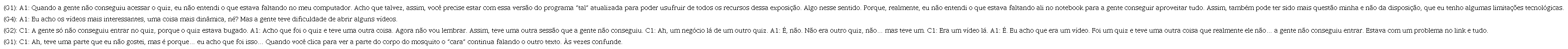 As dificuldades de navegabilidade também foram apontadas nas entrevistas ( Quadro 10 ) por cinco grupos (G1, G2, G3, G5, G6). Por outro lado, em geral a navegação no site foi considerada fácil (G2, G3, G4, G6), o que se explica pelo fato de que as dificuldades, na visão dos participantes, foram superadas intuitivamente (G2, G3, G6). Apesar de eventualmente os adultos explicarem para as crianças aspectos da usabilidade, 64 em dois grupos (G1, G6) foi sinalizada a diferença geracional, no sentido de que o manuseio teria sido mais fácil para as crianças. Sobre esse aspecto, vale mencionar que o ato de lidar com o ambiente virtual causou sentimentos de cansaço, indisposição ou susto para as mães de alguns grupos (G3, G4, G6). Além disso, a mãe do G5 comenta que o deslocamento no espaço expositivo é mais fácil na visita presencial, o que também podemos associar com dificuldade com a usabilidade/tecnologia.