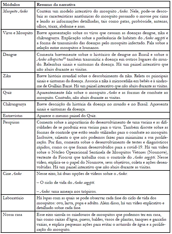 Ela está organizada em onze módulos: Vírus e mosquitos; Mosquito Aedes ; Dengue; Zika; Chikungunya; Pesquisa; Entrevistas; Cine Aedes ; Quiz; Laboratório; e Nossa Casa ( Quadro 1 ). Segue a mesma estrutura da exposição física itinerante, apenas com a diferença da divisão em módulos: os seis módulos da exposição física foram desmembrados em onze, para melhor adaptação virtual. 32 Conta com elementos interativos, vídeos, painéis textuais e informações apresentadas em áudio, além de um efeito sonoro em forma de zumbido de mosquito, que pode ser escutado em alguns experimentos e que complementa o sentido de imersão possibilitado pela tridimensionalidade. Com o intuito de facilitar a navegação dos visitantes, os textos que compõem a exposição virtual podem ser aumentados com a ferramenta zoom, e alguns deles estão disponíveis em áudio e Libras, além de versões em inglês e espanhol. 33