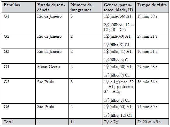 Em nosso estudo, cada grupo familiar deveria ser composto por no mínimo um adulto e uma criança de até doze anos completos. O grupo era considerado uma família quando seus membros eram biologicamente relacionados ou eram considerados família pelos próprios membros do grupo, 35 sendo necessária a existência de alguma relação de criação/responsabilidade pela criança. Para facilitar a análise das interações, o número de integrantes da família foi estipulado em até cinco participantes, mas não ultrapassou três membros.