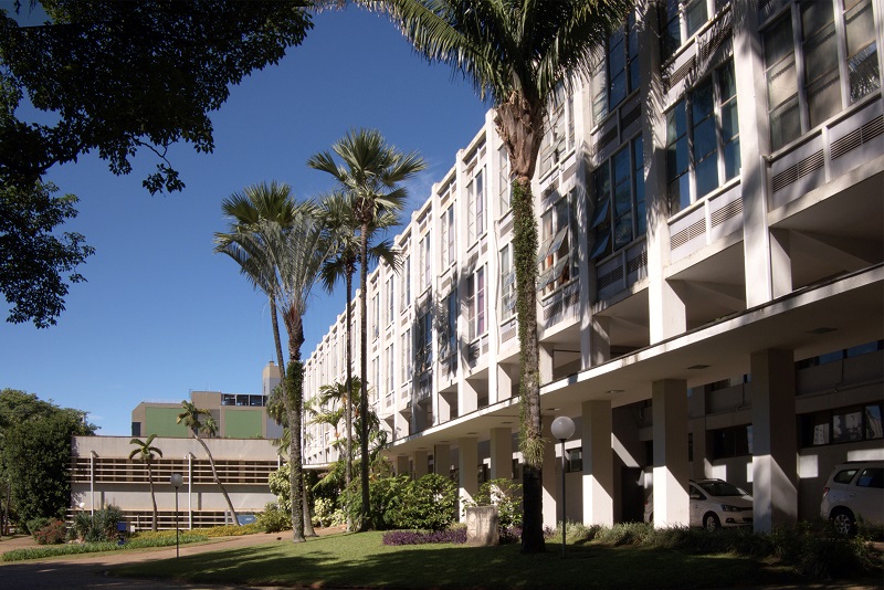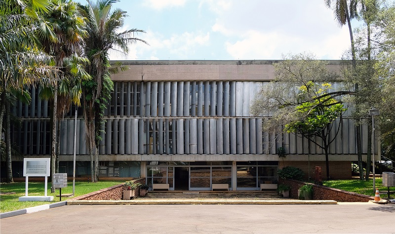 O programa se desenvolve num volume principal de três pavimentos em vidro e mais três anexos, que abrigam biblioteca, auditório e um setor técnico da Agência Paulista de Tecnologia dos Agronegócios (Apta). A estrutura desse bloco principal é composta por 22 eixos estruturais de pilares externos e internos em sequência linear. Os pilares externos são contínuos na fachada e dão a identidade desse edifício; já a estrutura interna encontra-se em boa parte oculta pelas paredes divisórias nos pavimentos superiores. Uma sequência de pórticos faz a transição da carga desses pilares para as robustas colunas no perímetro do térreo, conformando com os pilares externos uma galeria externa de circulação, que é protegida por uma marquise ( Figura 7 ).