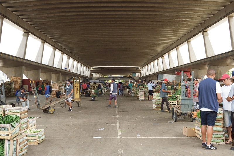 O MLP efetivamente construído foi concebido como um pavilhão em concreto de 50 × 360 metros (duplicado na década de 1970) e é essencialmente uma cobertura ( Figura 9 ). Pilares em forma de “Y” espaçados a cada 13 metros apoiam uma viga calha, que, por sua vez, recebe uma laje de concreto plissada e levemente arqueada, vencendo por si só o vão transversal de 36 metros sem a necessidade de tirantes, graças a sua geometria e ao sistema de protensão elaborado pelo escritório de Ferraz. Tal engenhosidade reduz os elementos construtivos ao mínimo, aumentando a impressão de fluidez e síntese. A sequência de pilares é travada por uma marquise em caixão perdido que vence o vão dos intercolúnios e conforma o abrigo para carga e descarga em toda a extensão do mercado. A parte inferior das marquises é uma laje de superfície curva, adelgada nas pontas, que, pelo seu desenho, faz um contraponto à curva superior da cobertura plissada e à geometria dos apoios, realizando um conjunto harmônico de linhas e formas que chamam a atenção para a estrutura.