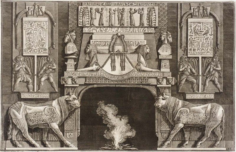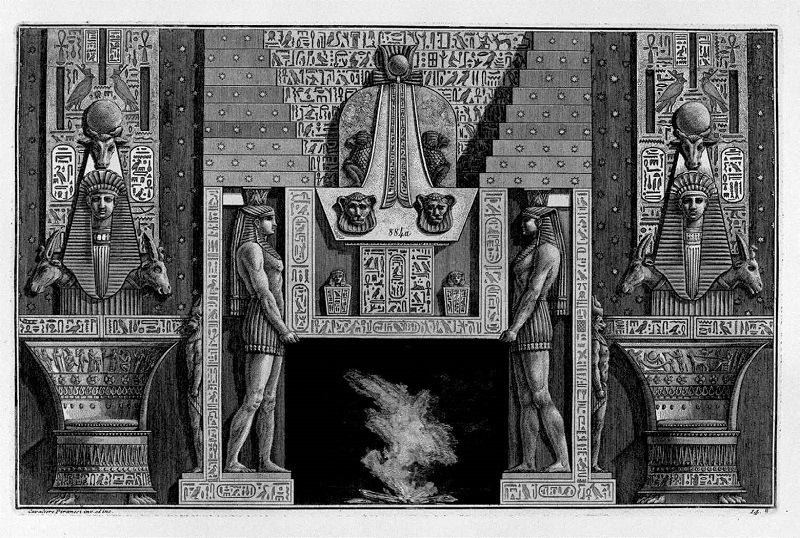O léxico egípcio constituía uma das “maneiras” (como sugere o título da obra aqui analisada) a serem consideradas para a proposição das invenções. Nessas gravuras de lareia ao “estilo egípcio”, os imponentes elementos dominam o espaço visual para um expectador que, atônito, se rende diante de estruturas sobre as quais se dispõe uma ornamentação, tão potente e atemporal como os próprios hieróglifos. Essas invenções estão submetidas a uma ordem na qual Piranesi mesclou o antropomórfico com o animalístico; a escultura se funde com luz e sombra nascidas da combinação de maciças formas geométricas vestidas por ornamentos. Essas pequenas arquiteturas metamórficas são constituídas por uma dinâmica permanente que, conceitualmente, colidem com sua aparente imutabilidade visual.