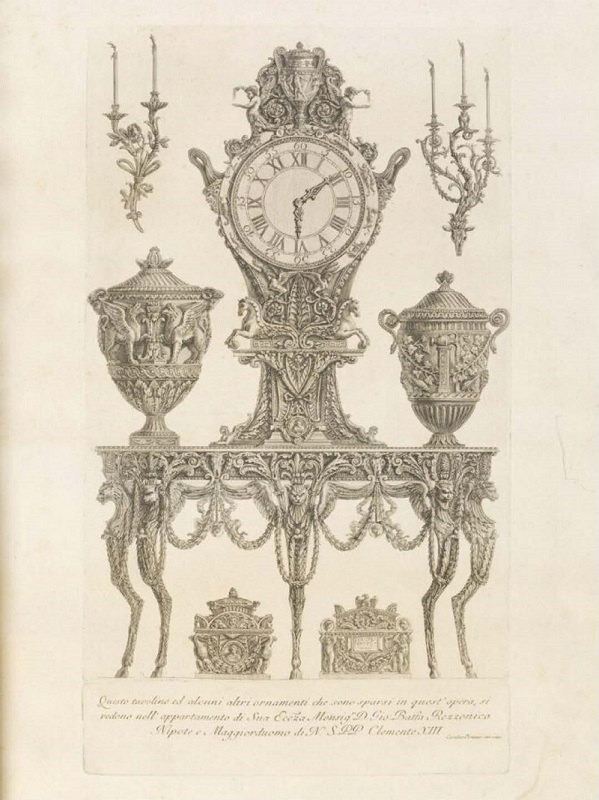 Em 1769, Piranesi encerrou a década mais produtiva de sua carreira com uma publicação de intenção decorativa. A obra Diverse maniere d’adornare i cammini ( Figura 1 ) é uma série experimental com 67 pranchas de composições, sendo: 52 de lareiras, duas pranchas para a ornamentação interna de paredes (afrescos) e o restante para mobiliário e outros objetos (como relógios, vasos, carruagens etc.), que ilustram comissões executadas para membros da família do papa veneziano Clemente XIII (Carlo della Torre-Rezzonico, 1693-1769) ( Figura 2 ).