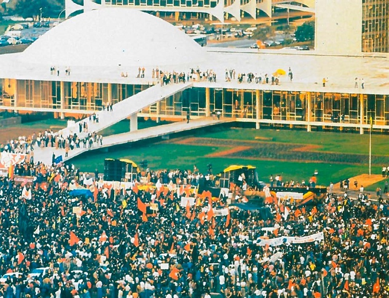 Previsto no Plano Piloto de Brasília de Lucio Costa como marco vertical no vértice da Praça dos Três Poderes e articulando essa Praça à Esplanada dos Ministérios, o Palácio do Congresso Nacional já era um dos pontos fulcrais de Brasília antes mesmo da definição de sua arquitetura. 1 Construído com projeto arquitetônico de Oscar Niemeyer, 2 tornou-se símbolo da cidade, constituindo, junto com as colunas da Alvorada e do Planalto, “signos do Estado, do País e do próprio desejo de modernidade brasileira” 3 . Não por acaso, algumas das imagens mais dramáticas da cidade-capital incluem o Palácio do Congresso não como fundo distante, mas como cenário da ação (Figuras 1 a e 1 b). 4