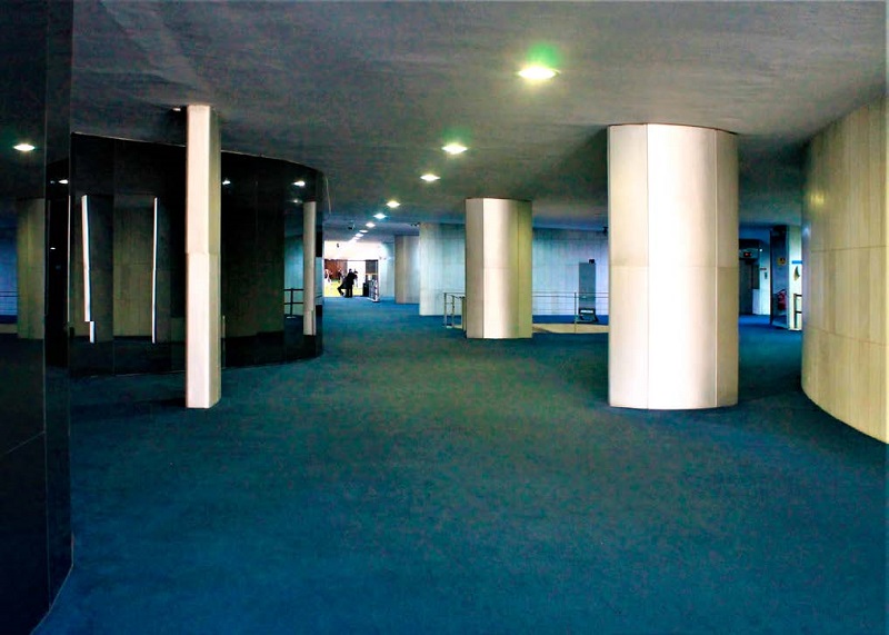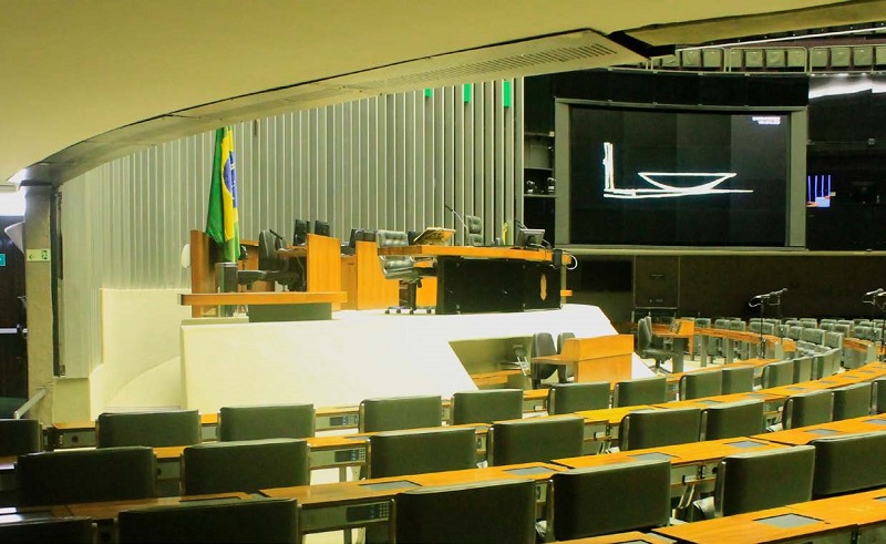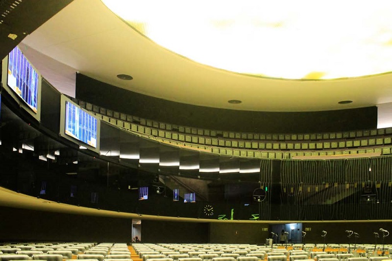 Depois de mais de dez anos de uso, a primeira motivação apresentada para a reforma foi a necessidade de “urgentes reparos, inclusive no tocante a som, iluminação, ar-condicionado e sistema eletrônico de votação” 51 ; secundariamente, referiu-se “o caráter provisório de suas instalações”. Contudo, também não se trata de concluir a execução do projeto de 1957, mas de atualizar as instalações e a aparência dos plenários para a década de 1970, seja na substituição dos lambris de madeira por vidros escuros (na Câmara), seja na mudança do reboco pintado de branco para espelhos fumê e carpete azul (no Senado).