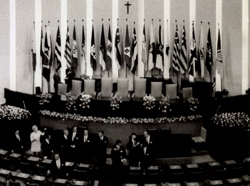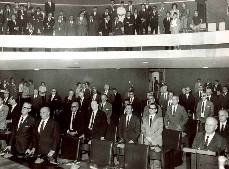 Inaugurado inacabado em 21 de abril de 1960, o Palácio do Congresso teve atividades de projeto, execução e pagamentos à firma construtora até 1964 – ano que pode ser considerado como de sua efetiva conclusão. 9 As dimensões do Palácio, a existência de duas estruturas administrativas independentes, com duas equipes de obras e manutenção, bem como a difusão do poder entre dezenas de senadores e centenas de deputados convergiram para multiplicar intervenções de pequeno, médio e grande portes ao longo das décadas seguintes. 10 Assim, observam-se tanto a eliminação de valores do projeto inicial, como uma enriquecedora estratificação de testemunhos em determinados espaços-chave. Seguindo uma indicação de André Castro, exploramos a importância dessas transformações para os valores culturais do Edifício Principal: