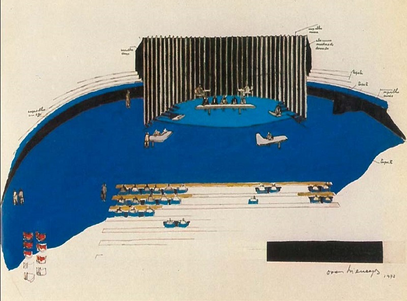 A execução da obra deu-se no recesso parlamentar entre 1977 e 1978. 57 Anotações na planta baixa disponível no acervo do Senado, talvez do próprio Niemeyer, indicam as especificações, a introdução de um painel artístico ao fundo do Salão Nobre e a criação das superfícies curvas que passaram a caracterizar o saguão. Os acabamentos em espelhos fumê e carpete azul ultramar, introduzidos no plenário em 1971-1972, foram estendidos a esse espaço, que terminou por ser chamado de Salão Azul (Figuras 8 b e 8 c). Em junho de 1978, autorizou-se a aquisição dos painéis artísticos para o Salão Nobre – um de Athos Bulcão, instalado aproximadamente na localização prevista no projeto, e um de Marianne Peretti, denominado Lago e peixes , não previsto nas pranchas de projeto identificadas ( Figura 9 ). 58
