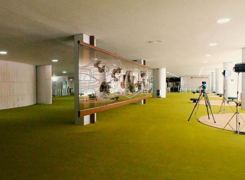 Por sua vez, as obras realizadas pela Câmara dos Deputados no saguão do pavimento inferior do Edifício Principal correspondem à mesma lógica da intervenção em seu plenário: transformações físicas de maior porte, não-identificáveis após sua conclusão. As alterações se integram ao Plano de Preservação da Câmara, que pretende “resgatar valores da configuração original do edifício […]: setorização clara distribuída em blocos separados por largas circulações” 69 . Na etapa de 2019-2020, executaram-se: conversão das agências bancárias em salas de reunião para as lideranças partidárias; transferência de caixas eletrônicos do saguão para área segregada; e reconfiguração do saguão, com eliminação de elementos físicos da área de exposições Espaço Ivandro Cunha Lima, criação de área de recepção de visitantes e substituição do revestimento de piso tipo Paviflex preto por granito verde Ubatuba ( Figura 17 ). 70 Além da resolução de questões funcionais, a intervenção aumentou a fluidez do saguão e sua integração às demais áreas mais representativas do Palácio.