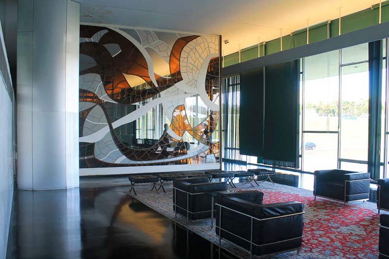 Mesmo pouco visível a partir do exterior, essa intervenção transformou irreversivelmente a espacialidade dos ambientes voltados para a Praça dos Três Poderes. No alinhamento da fachada leste anteriormente existente, criou-se um jardim interno em dois níveis, tendo por fundo um extenso painel de azulejos concebido por Athos Bulcão, denominado, a posteriori , Ventania . De forma ainda mais clara do que os túneis de ligação aos anexos, essa ampliação evidencia que já não estava mais em andamento a conclusão do prédio a partir de seu projeto, e sim o enfrentamento de questões não atendidas pelo edifício conforme concebido e construído. Definiam-se, assim, características novas para a arquitetura.