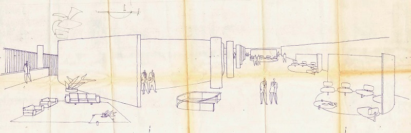 Em dezembro do mesmo ano, o presidente do Senado relatou os “entendimentos mantidos com o arquiteto Oscar Niemeyer, no sentido de ser restabelecida a nobreza dos saguões do Senado, a exemplo do que fez com a Câmara” 54 . A primeira versão conhecida do projeto é um estudo de outubro de 1977. 55 O memorial do arquiteto justifica a intervenção partindo das melhorias de disposição e de iluminação propostas para o gabinete do presidente do Senado. Com essa reorganização, conseguiu desocupar o saguão do plenário, “enriquecendo-o plasticamente, dando-lhe a importância que suas funções exigem”. Com efeito, no Senado, essa área inicialmente livre permanecia tomada por escritórios, mesmo após a ampliação do Edifício Principal e a inauguração do Anexo II do Senado.