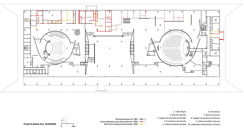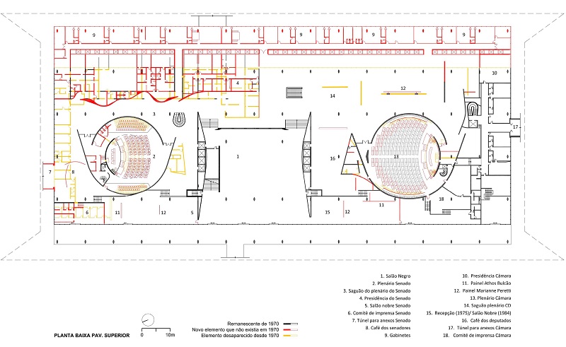 Na década passada, conforme se observa na prancha referente ao período 2010-2020, persistiu o ritmo de reformas periódicas em áreas como bancos, cafés e gabinetes parlamentares ( Figura 17 ). Houve também novas intervenções em ambos os plenários, de forma a garantir acessibilidade de pessoas com deficiência às tribunas e às mesas diretoras, com projetos das equipes de cada casa legislativa. Esse par de intervenções permite identificar novas abordagens arquitetônicas nas intervenções sobre o Palácio, relacionadas a seu progressivo processo de reconhecimento patrimonial, 64 que não significam o abandono completo dos métodos descritos na seção anterior.