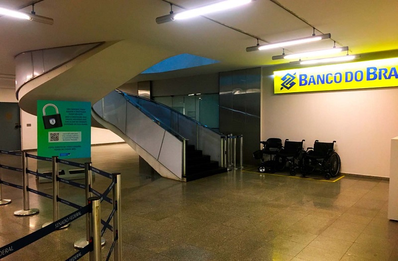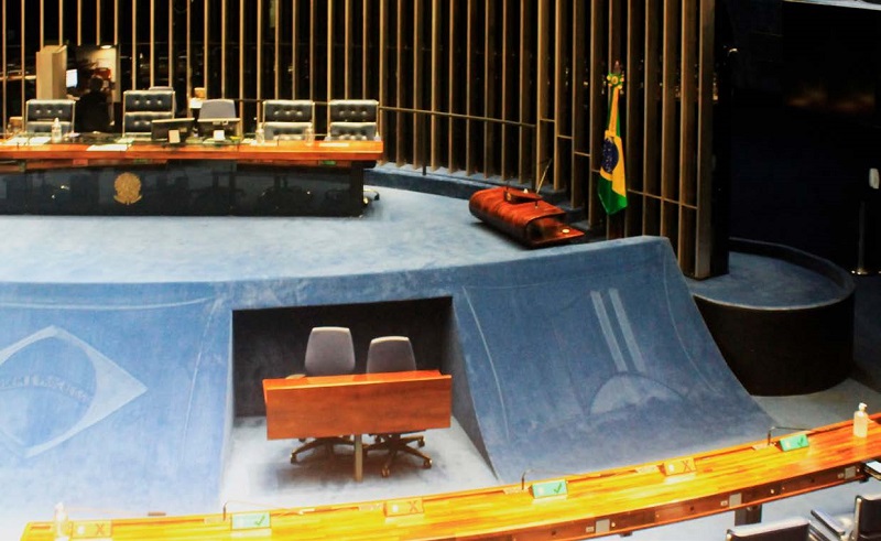 No plenário do Senado, a rampa construída para os mesmos fins, em 2018-2019, tem dois lances, com um patamar intermediário a partir do qual se acessa a tribuna. A maior extensão do percurso evitou a necessidade de rebaixamento da superfície elevada, mas também houve deslocamento do mobiliário fixo existente. O volume da rampa e de seu patamar se apresenta visivelmente como adição à construção existente, mas, por sua forma e materiais, não compromete a apreensão do espaço ( Figura 18 b). 67